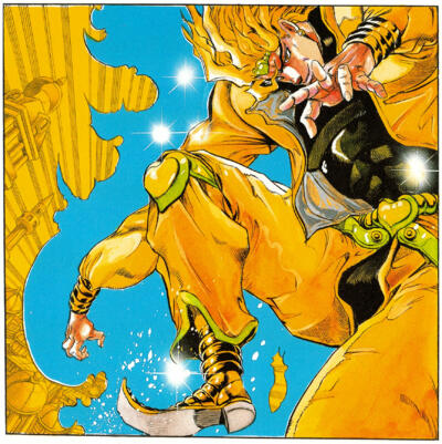 The World's power is its ability to stop time, allowing only itself, DIO and anyone with the same power, to act within the duration of stopped time. DIO is able to use this ability consistently, as shown as he is able to stop time with little to no fatigue, although this might be due to his vampiric nature or greater experience with his Stand.While time is stopped, DIO can move his own body, as well as his Stand freely, along with any object he touches, allowing him to strike his defenseless enemies, move to a superior position, and toy with his victims.All force applied by DIO during the time stop continues to exist after time resumes. This is seen when the objects that DIO throws can momentarily move during the stopped time before grinding to a halt, and then regaining its initial momentum once time starts moving again. A flurry of thrown knives could fly for several meters before stopping near Jotaro.Another unique feature of the time stop is how DIO can seemingly float in stopped time. Since no forces other than the time stopper's exist during a time stop, there is no force of gravity, allowing DIO to move freely in space as he wishes, with the help of his stand.It is notable that DIO needs to consciously activate Time Stop, which means that surprise attacks can prevent him from stopping time.